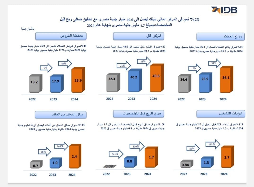 و نتيجة لما سبق و للجهود المبذولة من الإدارة التنفيذية والعاملين بالبنك فقد شهد البنك تحسناً ملحوظا فى نتائجه المالية للعام المالى المنتهي فى 31 ديسمبر 2024 لتعكس مؤشرات نمو قوية على مستوى كافة القطاعات وفقاً لما يلي: