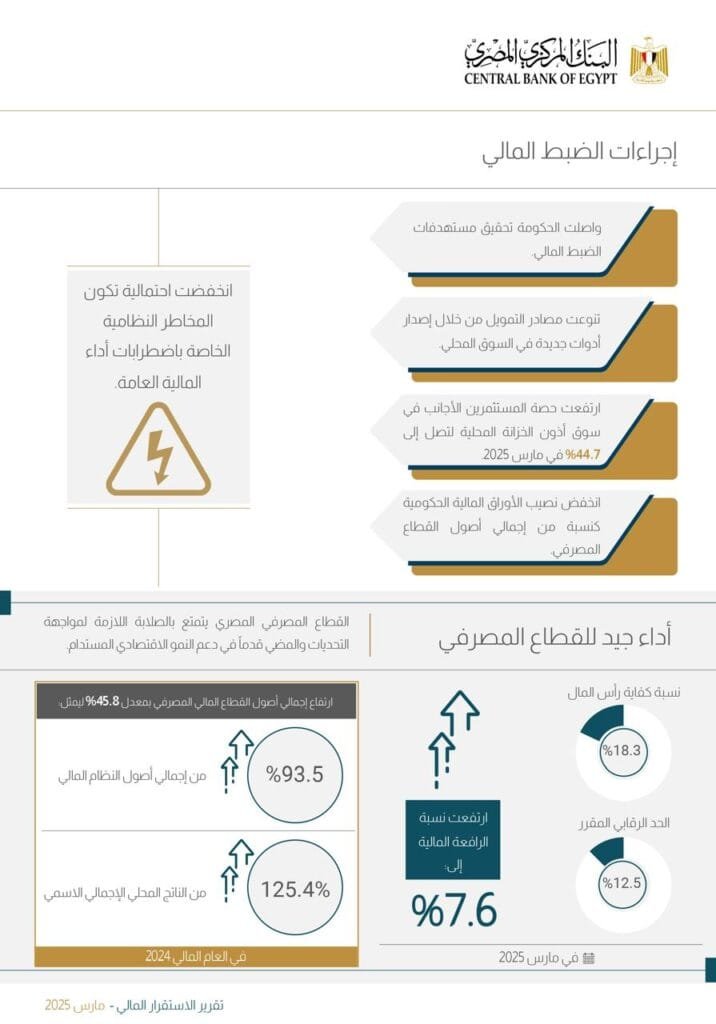 وسلط التقرير الضوء على استمرار القطاع المصرفي في توفير التمويل بالعملة الأجنبية، مع انخفاض احتمالية تعرضه للمخاطر النظامية المتعلقة بالخروج المفاجئ لرؤوس الأموال الاجنبية. ويأتي ذلك في ضوء وفرة النقد الأجنبي داخل القطاع المصرفي، نتيجة ارتفاع الصادرات غير البترولية، والإيرادات السياحية، وتحويلات العاملين بالخارج، والاستثمارات الاجنبية المباشرة طويلة الاجل، مما انعكس في التحسن في صافي الاحتياطيات الدولية بالعملة الأجنبية ليصل إلى 47.8 مليار دولار في مارس 2025، ليستمر في تغطية الدين الخارجي قصير الأجل بصورة كافية وأكثر من ستة أشهر من الواردات السلعية.