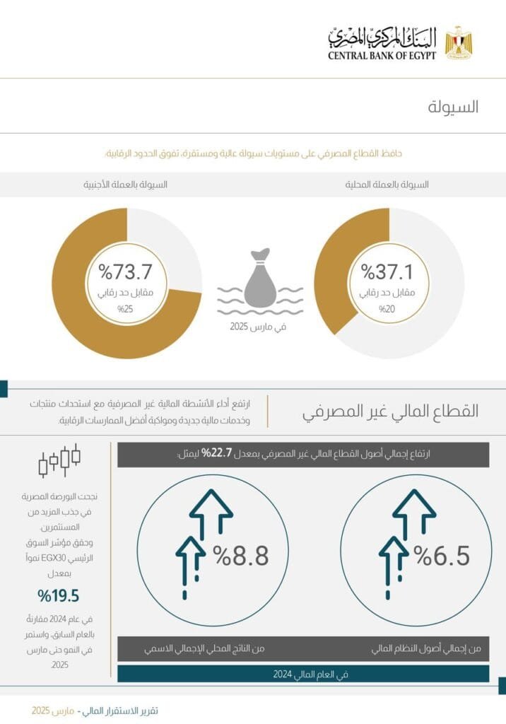 كما أوضح التقرير أن القطاع المالي غير المصرفي قد ساهم في استحداث منتجات وخدمات مالية جديدة، وذلك مع تطبيق معايير بازل 3 للأنشطة التمويلية غير المصرفية بهدف تعزيز قدرة الشركات لمواجهة المخاطر المالية المختلفة. هذا وقد شهدت اصول القطاع نمواً كبيراً بمعدل 22.7% في العام المالي 2024، لتمثل 6.5% من إجمالي أصول النظام المالي، و8.8% من الناتج المحلي الإجمالي الاسمي. كما نجحت البورصة المصرية في جذب المزيد من المستثمرين، وحقق مؤشر السوق الرئيسي EGX30 نمواً بمعدل 19.5٪ في عام 2024 مقارنةً بالعام السابق، واستمر في النمو حتى مارس 2025.