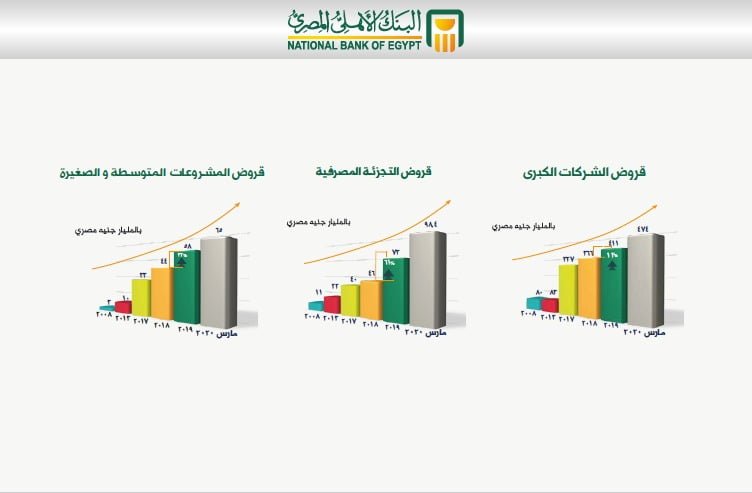 كما استمر البنك الأهلى المصرى فى دعم عملائه من خلال قطاع تمويل الشركات الكبرى وهو القطاع الذى يخدم الاقتصاد القومى بشكل واضح من خلال توفيرالاحتياجات التمويلية اللازمة لتشغيل العديد من المشروعات القومية فى مختلف القطاعات وهو ما يدفع نحو مزيد من النمو الاقتصادى، ويتضح ذلك من ارتفاع محفظة قروض الشركات الكبرى بنحو 60 مليار جنيه لتصل إلى 474 مليار جنيه فى مارس 2020 مقارنة بـ 411 مليار جنيه فى يونيو 2019، بالإضافة إلى تمويلات غير مباشرة بلغت 195 مليار جنيه، ونتيجة لاحترافية البنك وشبكة العلاقات القوية التى تربطه بالبنوك المحلية والدولية التى تتوافر لديها الثقة فى قدرة البنك على إتمام وإدارة الصفقات الكبرى بمهنية عالية مستندا فى ذلك إلى قاعدة رأسمالية كبيرة تتيح له فرصة ضخ تمويلات كبيرة، فقد حافظ على المركز الأول من مؤسسة بلومبرج عن قيامه بالأدوار المختلفة كوكيل التمويل ومرتب رئيسى ومسوق للقروض المشتركة، كما حصل البنك على 15 جائزة دولية، 14 منها مقدمة من مؤسسة Finance EMEA وذلك كأفضل بنك على مستوى قارة أفريقيا فى مجال القروض المشتركة والاستشارات المالية.
