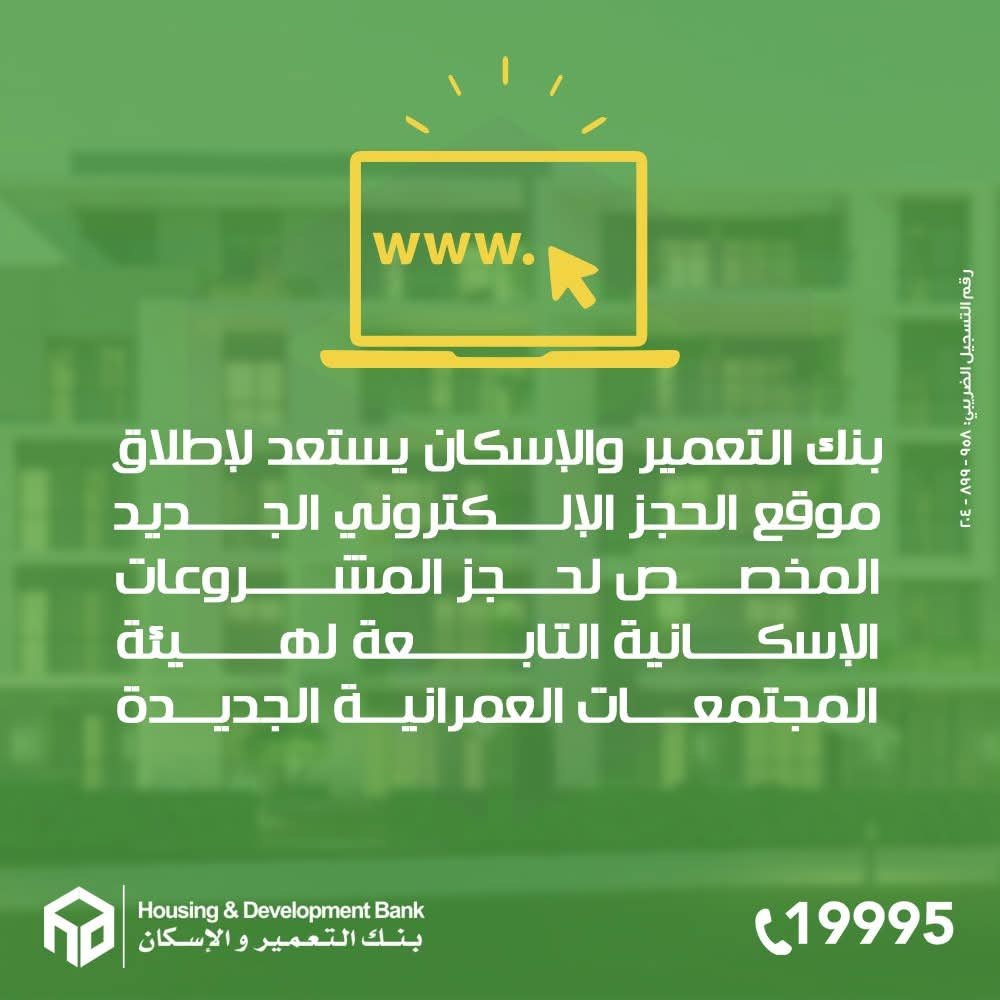 في إطار خطة البنك الاستراتيجية لتطوير الخدمات الإسكانية، وبالتعاون المستمر والمثمر مع وزارة الإسكان والمرافق والمجتمعات العمرانية، يستعد بنك التعمير والإسكان لإطلاق الموقع الإلكتروني الجديد، والمتخصص في الحجز الإلكتروني للمشروعات الإسكانية التابعة لهيئة المجتمعات العمرانية.
