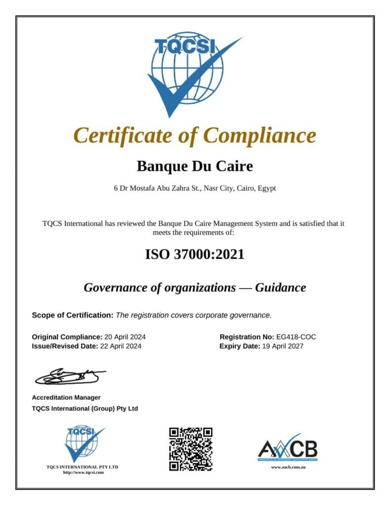 تأكيداً لريادته في تطبيق أفضل معايير الحوكمة المؤسسية، أعلن بنك القاهرة تمديد اعتماد شهادة الأيزو في مجال الحوكمة المؤسسية ISO 37000 للعام الثاني على التوالي، تتويجاً لجهوده المتواصلة في مواءمة أنظمته وإجراءاته مع المعايير الدولية المعتمدة.