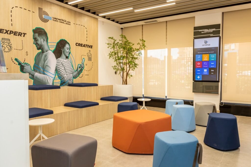 يحتوى الفرع على الشاشات الرقمية التي تعرض المواد الإعلانية والفيديوهات التسويقية وذلك في ضوء توجه البنك للحد من استخدام المطبوعات الورقية في عمليات الدعاية والتسويق للمساهمة في الحفاظ على البيئة والتنمية المستدامة، هذا بالإضافة لمنطقة الخدمات الرقمية الذاتية التي تتيح للعملاء التسجيل والحصول على كافة منتجات وخدمات البنك في أسرع وقت ومن ثم يقوم ممثلي خدمة العملاء بالبنك باستكمال نموذج الحصول على المنتجات من خلال نظام إلكتروني تم تطويره من قبل البنك .