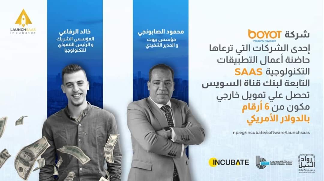 نجحت شركة Boyot Property Payment الناشئة العاملة في مجال التكنولوجيا المالية في مصر والمحتضنة من جانب حاضنة أعمال التطبيقات التكنولوجية SAAS التي يرعاها بنك قناة السويس من المسئولية المجتمعية للبنك في إطار مبادرة رواد النيل إحدى مبادرات البنك المركزي المصري، في الحصول على تمويل من 6 أرقام في جولة تمويلية ما قبل التأسيس والتي قادتها إحدى كبرى شركات التطوير العقاري في الكويت.