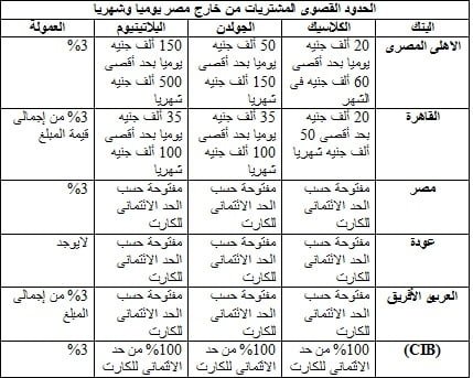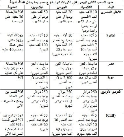 ونرصد فى التقرير التالى حدود السحب والمشتريات اليومى باستخدام الكريدت كارد فى 6 بنوك عامة وخاصة؛ وهى الأهلى المصرى ومصر والقاهرة والعربى آلافريقى الدولى وعودة والتجارى الدولى (CIB)