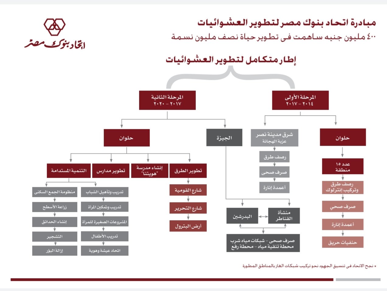 تصدت مبادرة اتحاد بنوك مصرللتصورالعام للمناطق العشوائية كمناطق تشكل عبئ علي المجتمع وتخضع لسقف من التطلعات فيما يخص تطويرها. ومن هنا ركزت المبادرة علي احداث التغيير الإيجابي في تلك المناطق عن طريق تفعيل تطوير متوازن يشمل البنية الأساسية و التنمية المجتمعية والبيئية للمساهمة في تحولها الي مناطق تنبض بالحياة وتتطلع الي التطوير. وقد تم تنفيذ ذلك المنهج في منطقتي “عرب واشد” و”كفر العلو” لتحديد النطاق الجغرافي واحكام التجربة ومتابعة النتائج.
