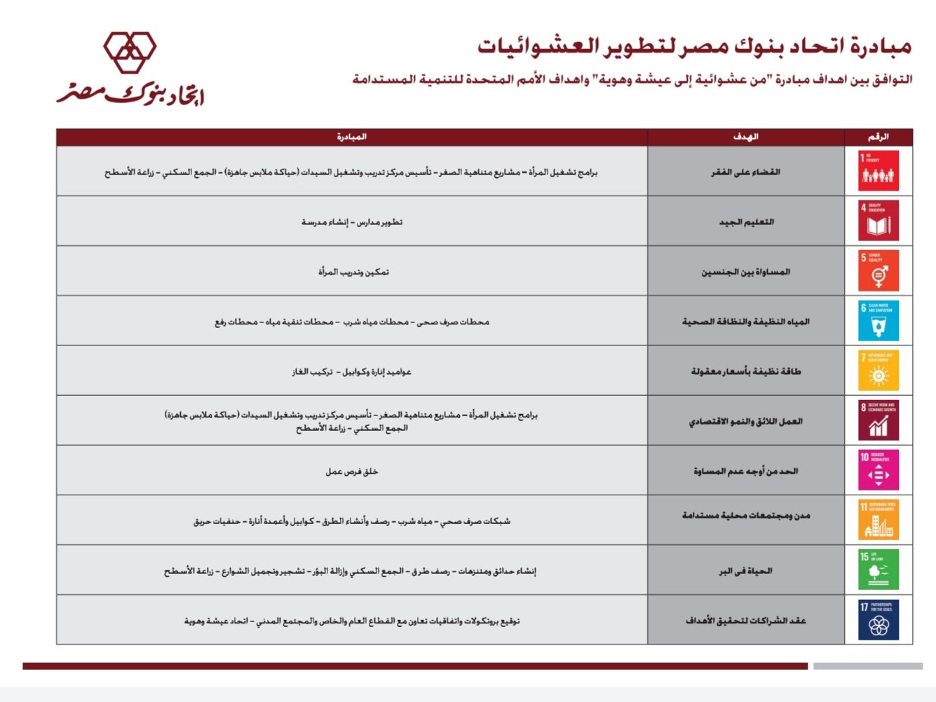 بالرغم من أن مبادرة اتحاد بنوك مصر بدأت عام 2014 ، إلا انها جاءت لتتوافق في كثير من جوانبها مع أهداف التنمية المستدامة التي تم إطلاقها من جانب الأمم المتحدة عام 2015. فمع التسليم بقيمة وأهمية أعمال تطوير المرافق الأساسية والبنية التحتية فى تحسين الظروف الحياتية للأهالي، كان هناك إدراك متزايد لأهمية التنمية البشرية والمجتمعية، ومن هنا أخذت لجنة التنمية المستدامة علي عاتقها تصميم وتنفيذ عدة مبادرات جاء أهمها فى قطاع التعليم وتأهيل وتدريب وتشغيل الشباب والمرآة، وغرس قيم المحافظة علي البيئة متمثلة فى الجمع السكني وإزالة البؤر والتشجير وإنشاء الحدائق وزراعة الأسطح.