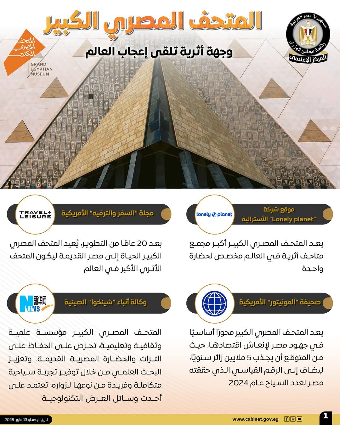 المتحف المصري الكبير يحظى بإشادات دولية واسعة باعتباره الأكبر عالميًا المخصص لحضارة واحدة، وواجهة تجمع بين العلم والثقافة والسياحة الحديثة، تقارير دولية وصفته بأنه من أبرز مشروعات مصر الاستراتيجية، لدوره في تنشيط الاقتصاد وجذب ملايين الزوار سنويًا، مع اعتماده على أحدث تقنيات العرض المتحفي.