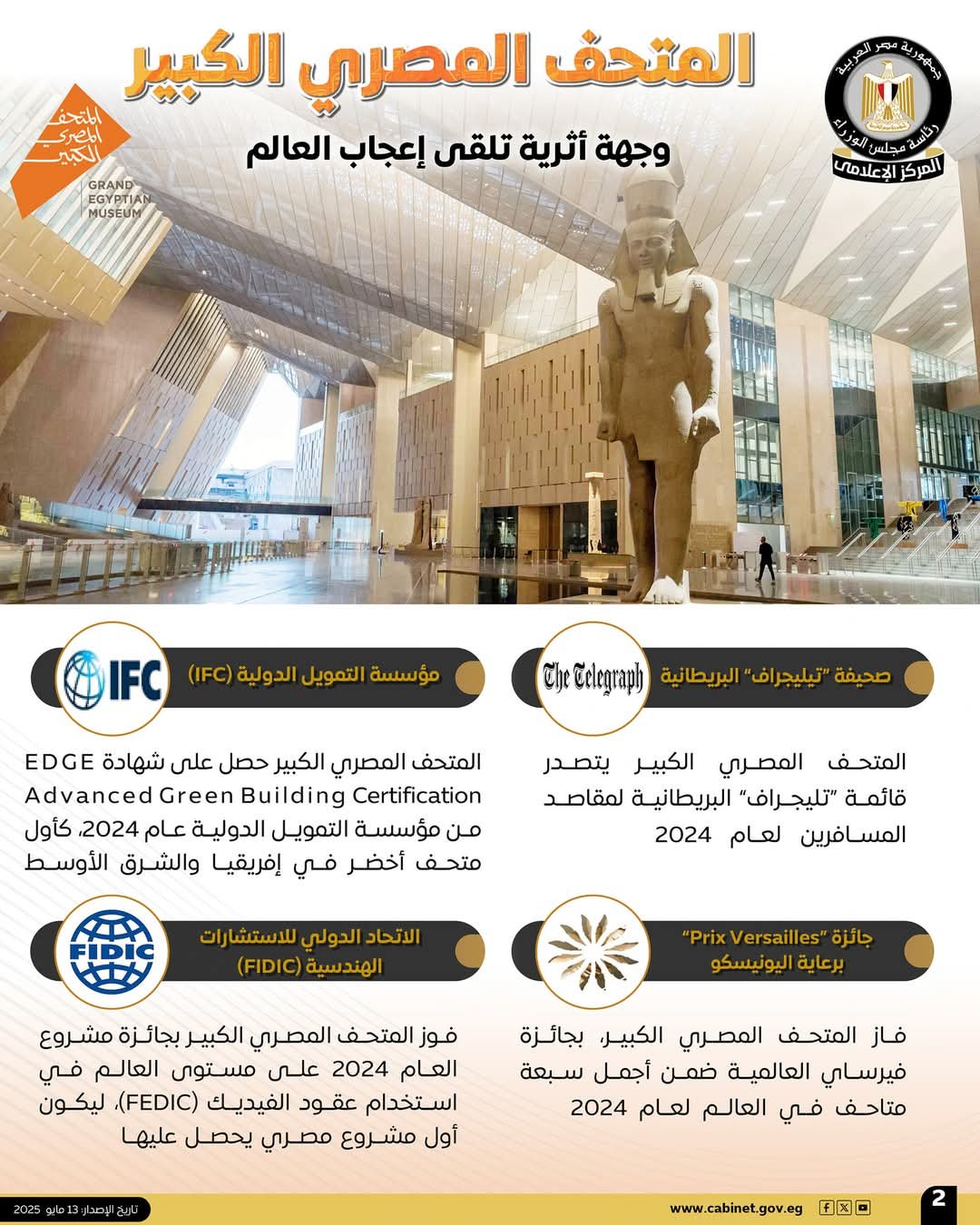كما حصد عدة جوائز دولية في 2024، منها جائزة فيرساي كواحد من أجمل المتاحف في العالم، واعتماد “EDGE Advanced” كأول مبنى متحفي مستدام في الشرق الأوسط وإفريقيا، إلى جانب تتويجه بمشروع العام من FIDIC، وتصدره قوائم السفر العالمية.