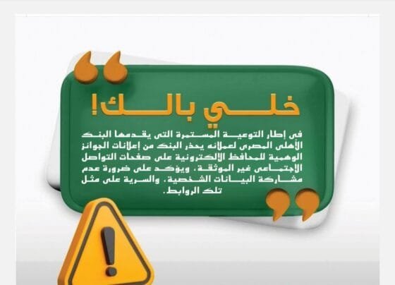 في إطار التوعية المستمرة التي يقدمها البنك الأهلي المصري لعملائه، يحذر البنك من إعلانات الجوائز الوهمية للمحافظ الإلكترونية على صفحات…