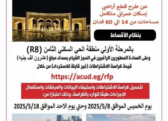 أعلنت شركة العاصمة الادارية للتنمية العمرانية عن طرح قطع أراض عمراني متكامل بمساحات من 14_ 60 فدان بنظام التقسيط وذلك…